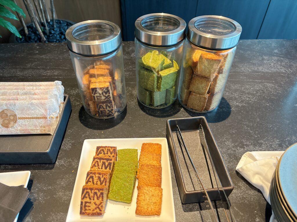 ラウンジエリア内ではソフトドリンクや練り切りやアメックスロゴ入りのクッキーなど、ちょっとしたスイーツを楽しめます。