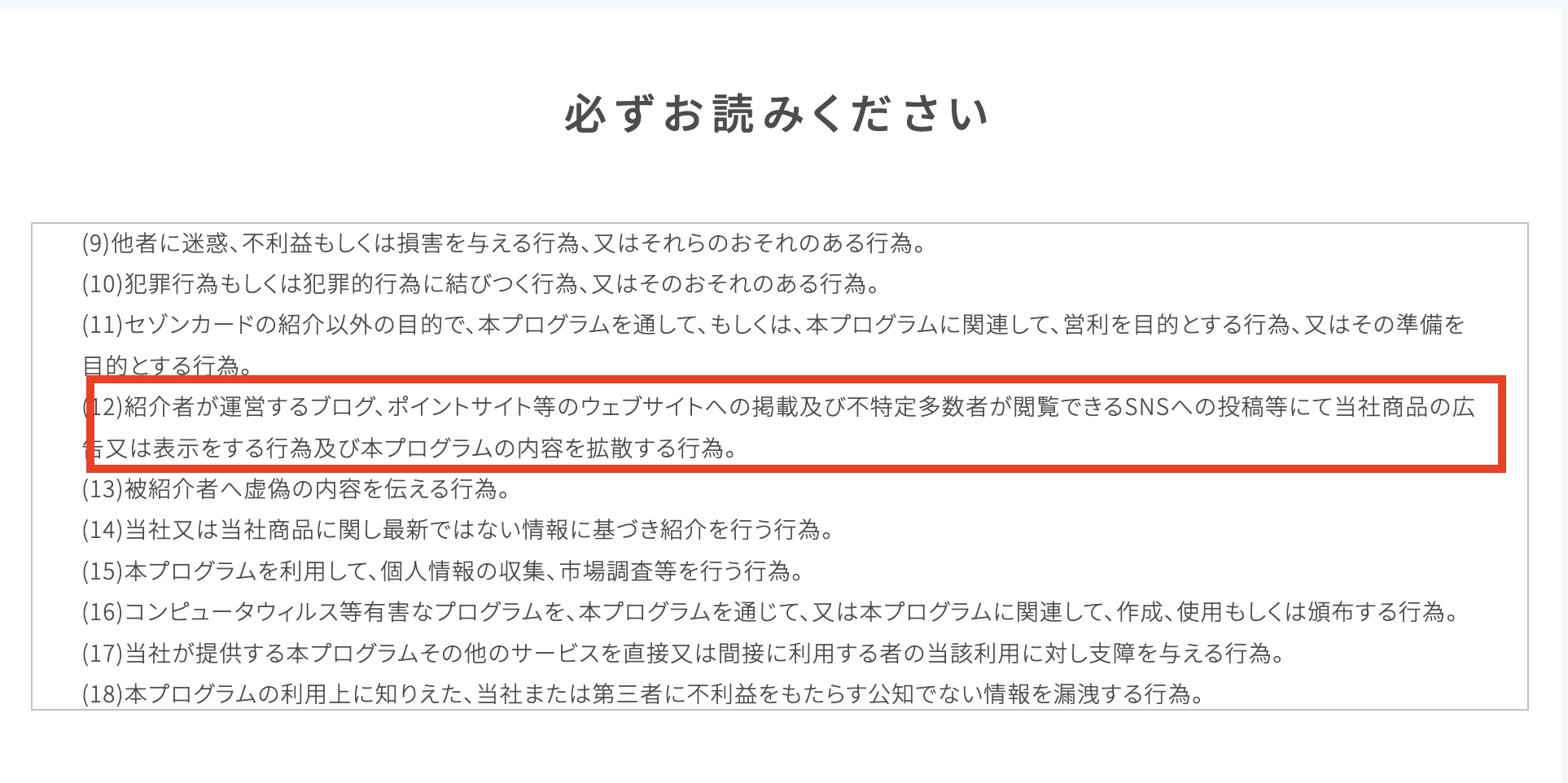 こちらの情報は「セゾンのご紹介プログラム」利用規約第7条(禁止事項)12項にしっかりと明記されています。